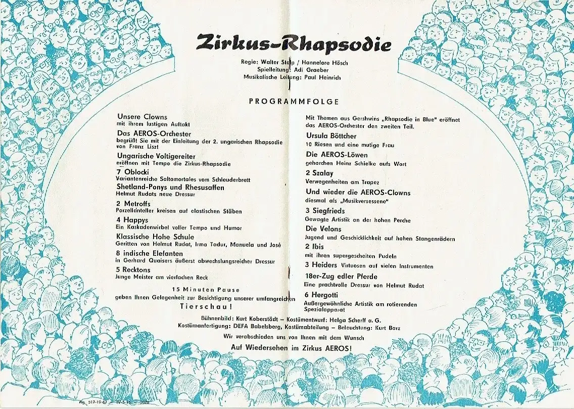 sehr guter Zustand, geringe Gebrauchs- und Alterungsspuren: senkrecht teils leicht angeknickt, Programmheft der Saison 1967 mit Programmfolge u. a. - Ursula Böttcher und ihre Eisbären - Helmut Rudat mit Shetland-Ponys und Rhesusaffen / mit Klassischer Hoher Schule / mit 18er-Zug edler Pferde  - Heinz Schielke und die Aeros-Löwen - Ungarische Voltigereiter - 2 Metroffs - 5 Recktons - u. a, Softcover, ca. 14,5 x 20,5, 24 Seiten mit 24 Fotos