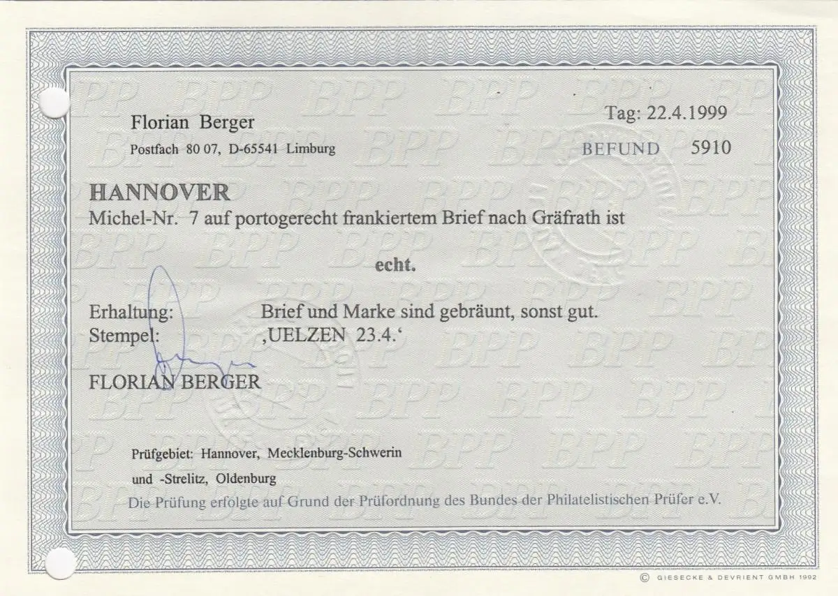 Hanovre: MiN° 7 sur lettre üelzen für Gräfrath, BPP résultat