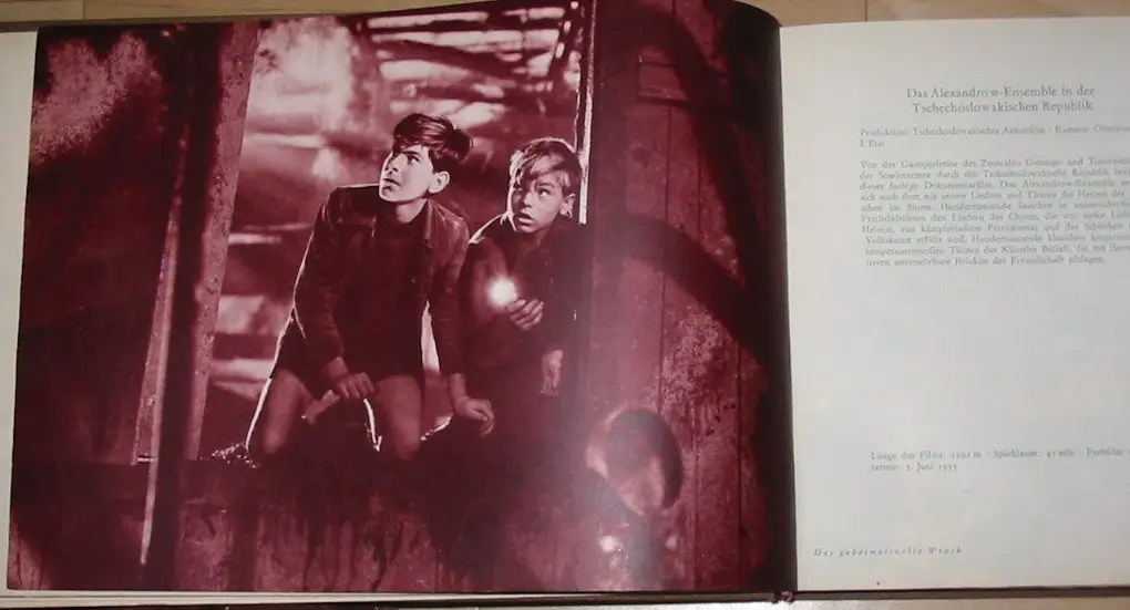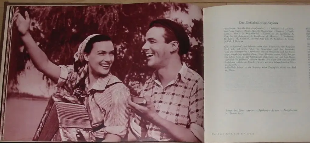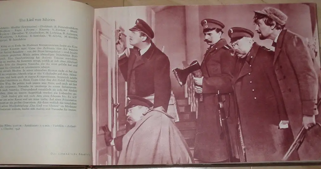 guter Zustand, geringe Gebrauchs- und Alterungsspuren: Einbandecken und -kanten teils gering abgenutzt - Bindung gelockert, Leinen in den Rückenecken ca. 1 cm gerissen - Seiten sauber und ordentlich, erste und letzte Seite teils minimal fleckig - hintere Vorsatzseite im Falz ca. zur Hälfte gerissen, geknickt und oben mit großem Eselsohr, Der Spielfilmkatalog gibt einen zuverlässigen Überblick über alle am 31. Dezember 1955 für den Einsatz zur Verfügung stehenden abendfüllenden, ab 1000 m langen Spiel-, Dokumentar-, Kultur- und Kinderfilme. Nach dem 31. Dezember 1955 vorgenommene Filmzurückziehungen sind bis einschließlich 31. Juli 1956 berücksichtigt. Bei den einzelnen Filmen sind die hauptsächlich interessierenden Angaben über Produktion, Spieldauer und Länge des Films verzeichnet. Eine kurzgefaßte Charakteristik soll Aufschluß über den Inhalt des Films geben. Ferner sind Autor, zugrundeliegendes Literatur- oder Bühnenwerk, Regisseur (in besonderen Fällen auch der Dialogregisseur), Kameramann, Komponist und Darsteller festgehalten, soweit ihre Namen auf den uns zur Verfügung stehenden Originalunterlagen oder im Vorspann des Films genannt waren. Unter dem Anlauftermin ist der Tag der ersten öffentlichen Aufführung des Films in der ehemaligen sowjetischen Besatzungszone bzw. in der Deutschen Demokratischen Republik einschließlich des Demokratischen Sektors von Berlin genannt. Bei den deutschen Filmen (Reprisen), die nach 1945 hier neu eingesetzt wurden, ist das Datum der Wiederaufführung verzeichnet. Das Titelregister ermöglicht die schnellste Auffindung jedes einzelnen Films. Alle Filme sind nur über den zuständigen Kreislichtspielbetrieb entsprechend den Filmbezugsbedingungen zu beziehen ... stark gekürzte Inhaltsübersicht (Filmtitel + Herstellerland): - Abenteuer der Drei Musketiere, Die Frk./It. - Abenteuer im Roten Meer BR - Abenteuer in Marienstadt P - Abrechnung, Die Rum. - Adresse unbekannt Frk. - Affaire Blum DDR - Alarm Bulg. - Alarm im Zirkus DDR - Alexandrow-Ensemble in der CSR, Das CSR - Amphitryon (Aus den Wolken kommt das Glück) D - Amsel, Drossel, Fink und Star SU - An den Ufern der oberen Wolga SU - Anderen Weib, Des Frk. - Anna Susanna DDR - Arena der Kühnen SU - Arlberg-Expreß Ö - Aschenbrödel SU - Atlantische Erzählung P - Auf der Alm, da gibt's koa Sünd Ö - Aufenthalt vor Veracruz Frk./Mex. - Auf Jagd in den Donauwäldern Ung. - Auf Tierpfaden SU - Auf weiter Fahrt SU - Bad auf der Tenne, Das D - Bäcker vonValorgue, Der Frk. / lt. - Befreites Land Ung. - Berg ruft, Der D - Beste Mensch, Der CSR - Betrogene Betrüger, Der Frk. - Bewährung, Die Ung. - Biberpelz, Der DDR - Blaue Engel, Der D - Blauen Schwerter, Die DDR - Blaue Wimpel im Sommerwind DDR - Blinde sehen wieder SU - Blühendes Land an der Adria SU/Alb. - Boccaccio D - Brand im Ozean D - Brot, Liebe und Phantasie It. - Budapester Frühling Ung. - Bürgermeister Anna DDR - Buntkarierten, Die DDR - Cafe an der Hauptstraße CSR - Carola Lamberti ‒ eine vom Zirkus DDR - Chinesischer Zirkus SU - Chopins Jugend P - Clochemerle Frk. - Cordula Ö - Corinna Schmidt DDR - Danka Bulg. - Das Alexandrow-Ensemble in der CSR CSR - Das Bad auf der Tenne D - Das Bäumchen mit den goldenen Äpfeln CSR - Das doppelte Lottchen BR - Das Fräulein von Scuderi DDR/ Schwed. - Das geheimnisvolle Wrack DDR - Das Gesetz der großen Liebe SU - Das Geständnis CSR - Das goldene Schlüsselchen SU - Das große Abenteuer CSR - Das Haus in Montevideo BR - Das kalte Herz DDR - Das kleine und das große Glück DDR - Das Leben siegt Rum. - Das Lied von Sibirien SU - Das Mädchen Anna CSR - Das Moskauer Dynamo-Stadion SU - Das neue Peking SU - Das sollte man regeln P - Das schwedische Zündholz SU - Das Tal erschallt Rum. - u. v. a, Leinen, ca. 28 x 20 cm, 220 Textseiten mit 166 Bildtafeln und 15 Seiten Einführung