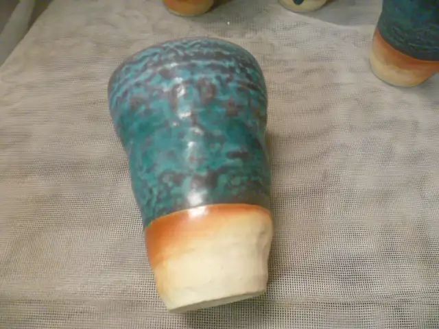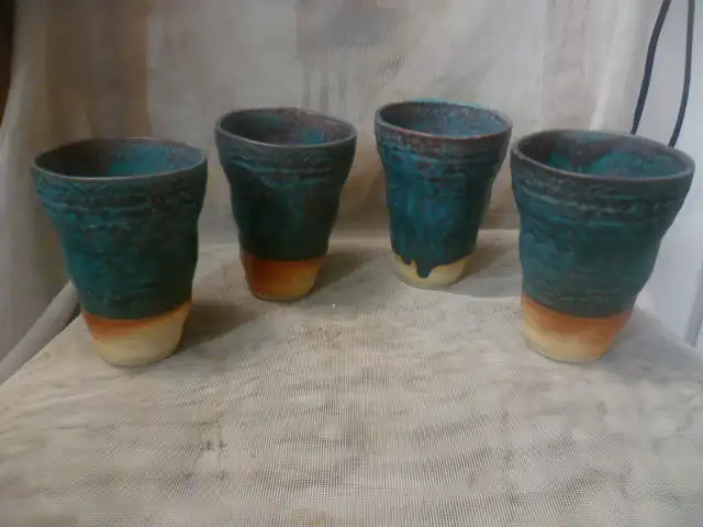 Hans Welling ? Brutalismus Designer 4 Set Türkis Lauflasur gesprenkelt von Hand getöpferte Keramik Weinbecher 1970