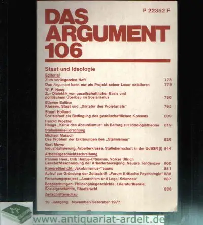 Das Argument 106; Fritz Haug; Staat und Ideologie; 19. Jahrgang November/Dezember 1977; Editorial; Stalinismus-Forschung; Arbeitergeschichtsschreibung; Kongressbericht; Besprechungen; Zeitschriftenschau; Gesellschaft; Politik; Sozialwissenschaft