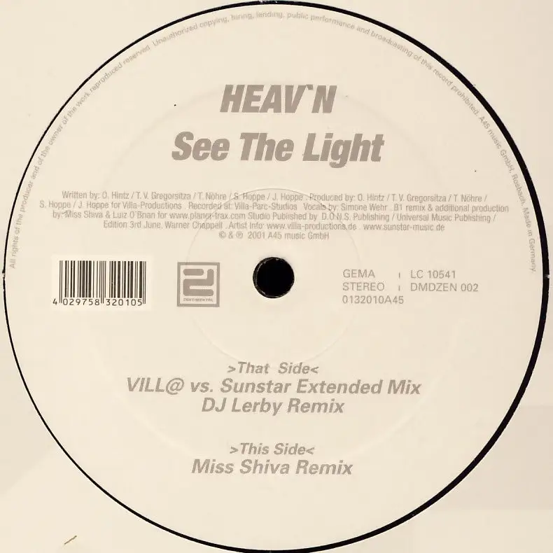 12" Maxi Heav'n - See The Light, Unitcover der Dischengesellschaft, État Platte M- Hülle M; Fabriqué en Germany 2001 Zentimental Records DMDZEN 002, Tracks [Vill vs. Sunstar Ext. Mix], [DJ Lerby RMX], (Miss Shiva RAMX]
