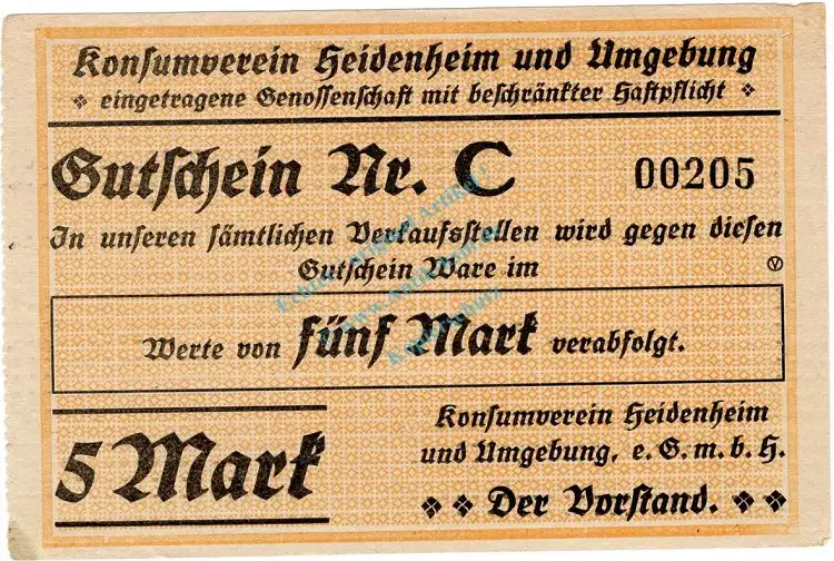 Heidenheim , Notgeld 5 Mark Schein unc-kfr. Ti.2860.10.03 , Württemberg o.D. Verkehrsausgabe