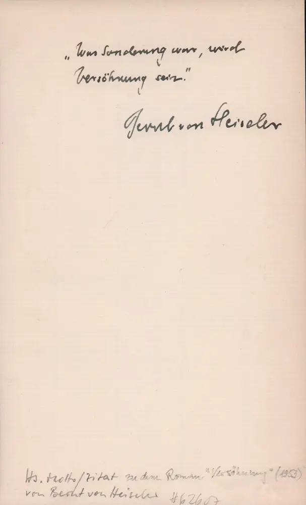 Seitenanzahl: Zweizeiliges Motto "Was Sonderung war, wird Versöhnung sein", handgeschrieben und signiert vom Schriftsteller Bernt von Heiseler (1907-1969)