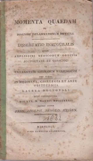 Heisen, (Friedr. Adolph Arnold): Momenta quaedam de diagnosi inflammationum difficili. Dissertatio inauguralis quam [...] in Universitate Literarum Marburgensi [...] rite consequenda (30. März 1832) scripsit.