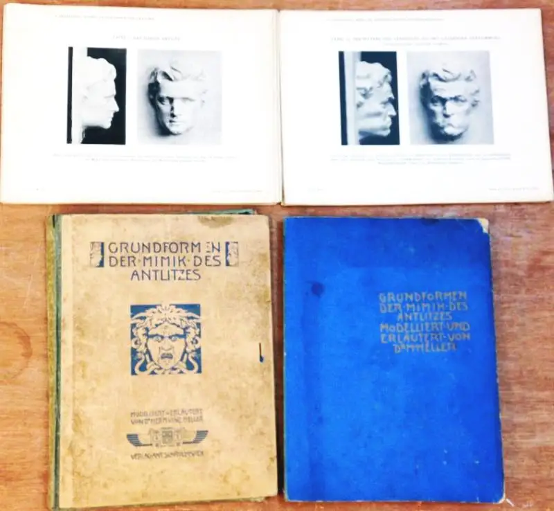 H. V. Heller (1866 Wien - 1949 Klagenfurt) war ein östrerreichischer Bildhauer, Maler und Arzt. Von 1911 bis 1942 unterrichtete er als Professor an der Akademie der Bildenden Künste in Wien. - Die Tafeln zeigen Gipsreliefs, Frontalansichten männlicher Köpfe mit unterschiedlicher Mimik (Taf. 1-50), Knochenformen (Taf. 51), Gesichtsmuskeln (Taf.l 52), Übrsicht über die mimischen Formen (Taf. 53). - Mappe fleckig und mit Einrissen, Textilschließe fehlt, Vorderdeckel des flexiberl Leinenbandes etwas fleckig und mit vertikaler Stauchung sowie mit kl. Eckausriss, innen gut erhalten, Titelblatt und einige Tafeln im Rand etwas fleckig, sonst gutes Exemplar dieses äußerst seltenen Werkes.