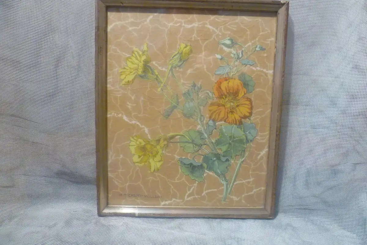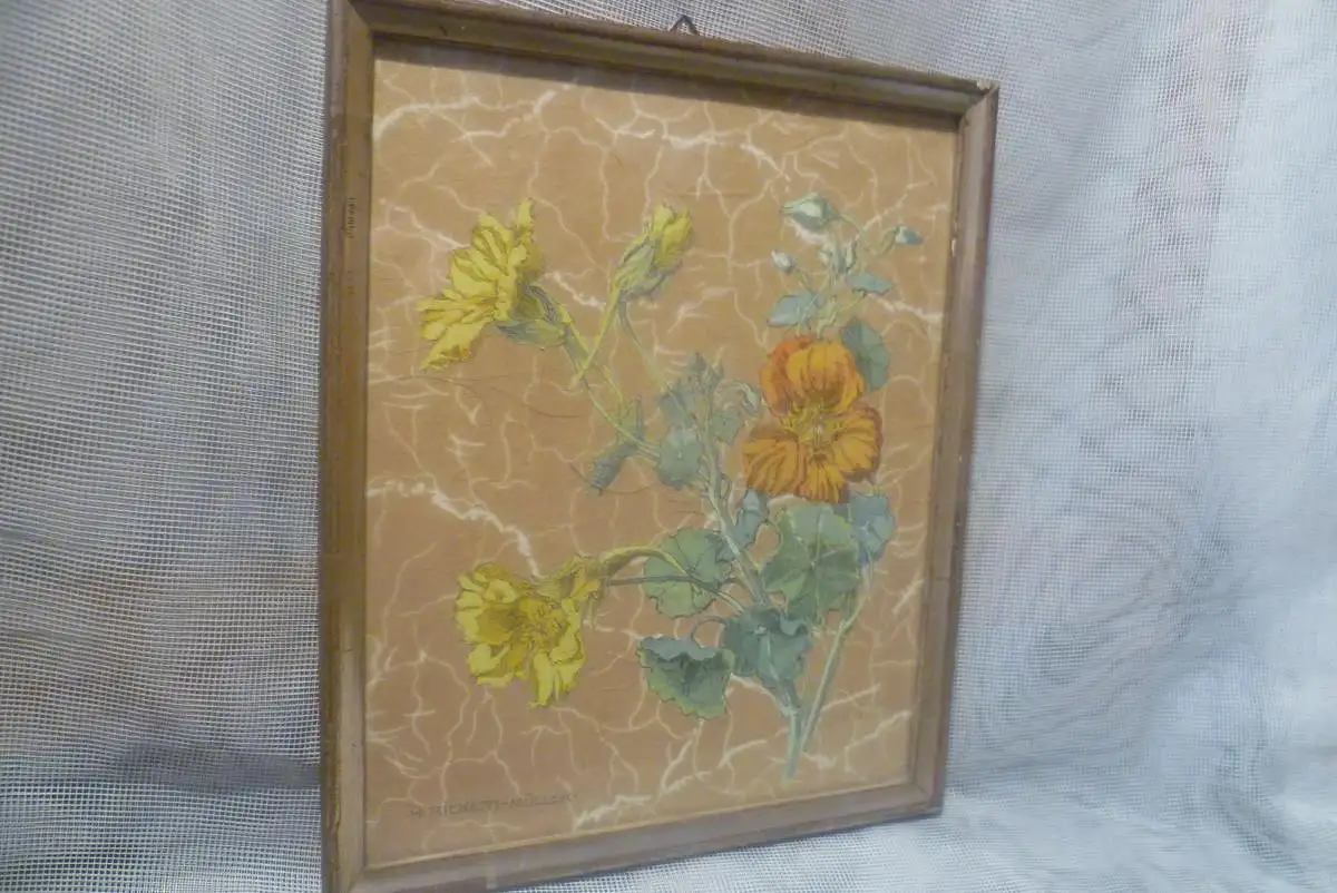 Aquarell "Bunte Blumenranken mit Rosen Nelken " links signiert H.Rickert - Müller