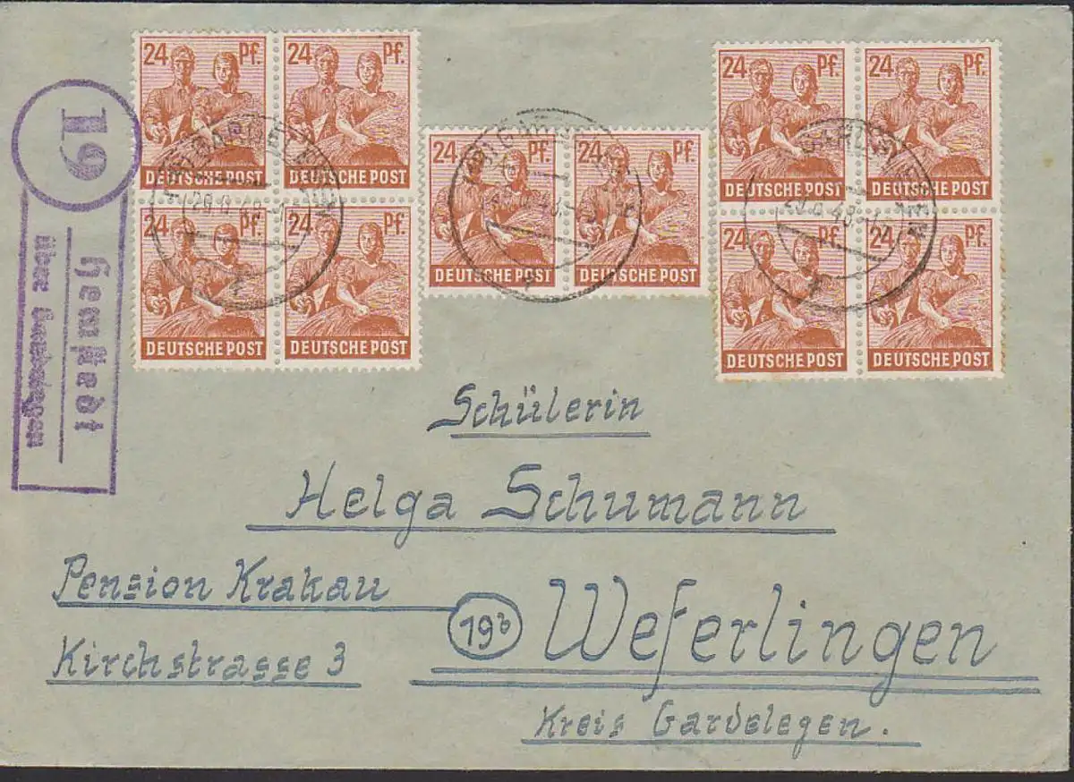 Hemstedt über Gardelegen 29.6.48 Zehnfach-Frankatur portogenau mit 24 Pfg. Kontrollrat II, Postleitgebietszahl 19