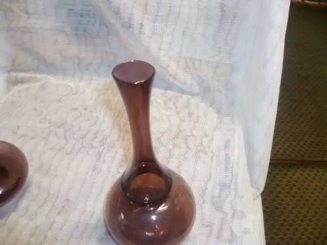 Hersteller: Marsberger Glaswerke Ritzenhoff, Marsberg (Horhusen); Glasvase Violettsfarben in Form mundgeblasen der 1960 er Höhe: 23,5 cm