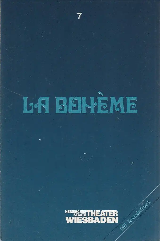Szenen aus Henri Murgers Vie de Boheme. Musikalische Leitung: Ulf Schirmer. Inszenierung: Wolfgang Quetes. Ausstattung: Klaus Teepe. Mitwirkende: Györgyi Benza, Lisa Griffith, Jonathan Welch, Eike Wilm Schulte, Albert Dohmen, Georg-Emil Crasnaru, Heinz Peters, Helmut Beetz, u.a. - Theaterprogramm, Opernprogramm, Ballettprogramm, Musicalprogramm, Konzertprogramm, Theatermemorabilia, Programmhefte Sammlung, deutsche Theatergeschichte.