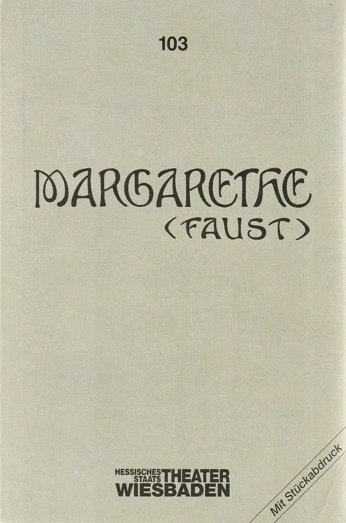 Hessisches Staatstheater Wiesbaden, Claus Leininger, Gunter Sellinh: Programmheft Charles Gounod MARGARETHE ( FAUST ) Premiere 14. März 1992 Spielzeit 1991 / 92 Programmbuch Nr. 103.