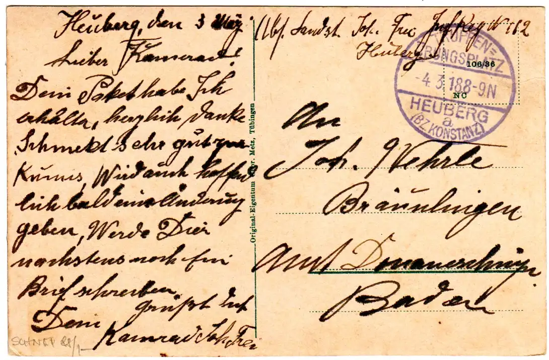 Heuberg, Truppenübungsplatz-Luftbild, 1918 gebr. Farb-AK.