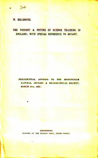 Hillhouse, W: The present & future of science teaching in England; with special reference to botany. (Presidental address to the Birmingham Natural History & Microscopical Society, March 6th, 1888.