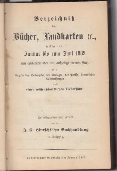 Hinrichs'sche Buchhandlung (Hrsg.): Verzeichniß der Bücher, Landkarten etc., welche vom Januar bis zum Juni 1882 neu erschienen oder neu aufgelegt worden sind, mit Angabe der Seitenzahl, der Verleger, der Preise, literarischen Nachweisungen und einer wiss