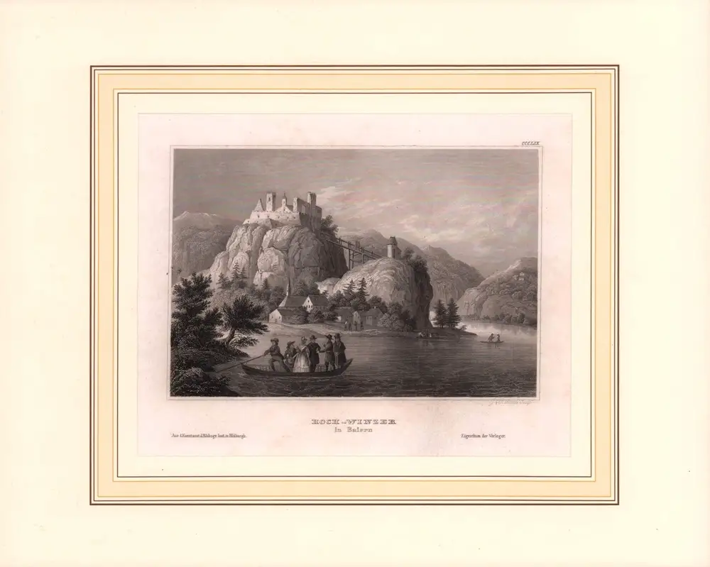 Ansicht der Burgruine mit einem, mit sechs Personen besetzten Stocherkahn im Vordergrund links und zwei kleineren Booten rechts sowie Personenstaffage am Fuße des Hoch-Winzers.- Im äußeren weißen Rand gebräunt