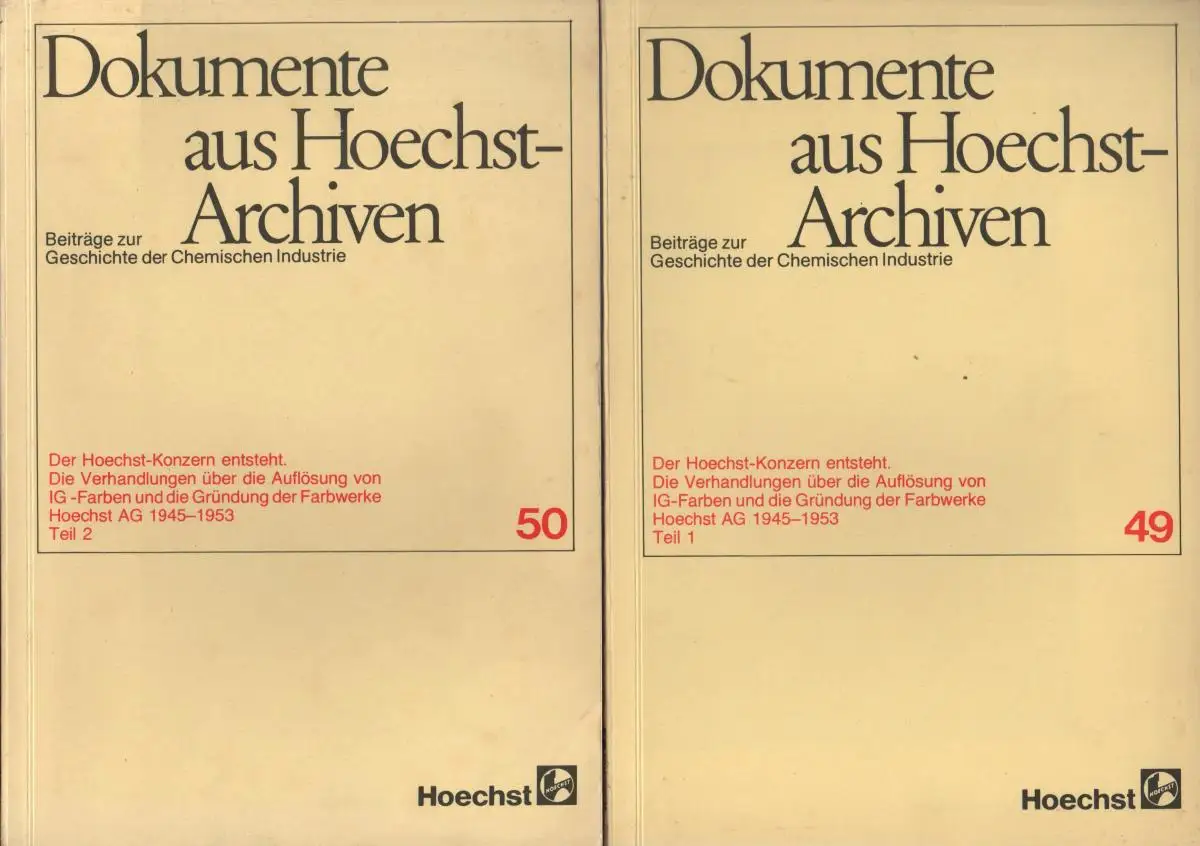Hoechst-AG / Trouet, Klaus (Hrsg.): Der Hoechst-Konzern entsteht. Die Verhandlungen über d. Auflösung von IG-Farben u. d. Gründung d. Farbwerke Hoechst AG 1945-1953. 2 Bde. (Dokumente aus Hoechst-Archiven. Bd.49 + 50).
