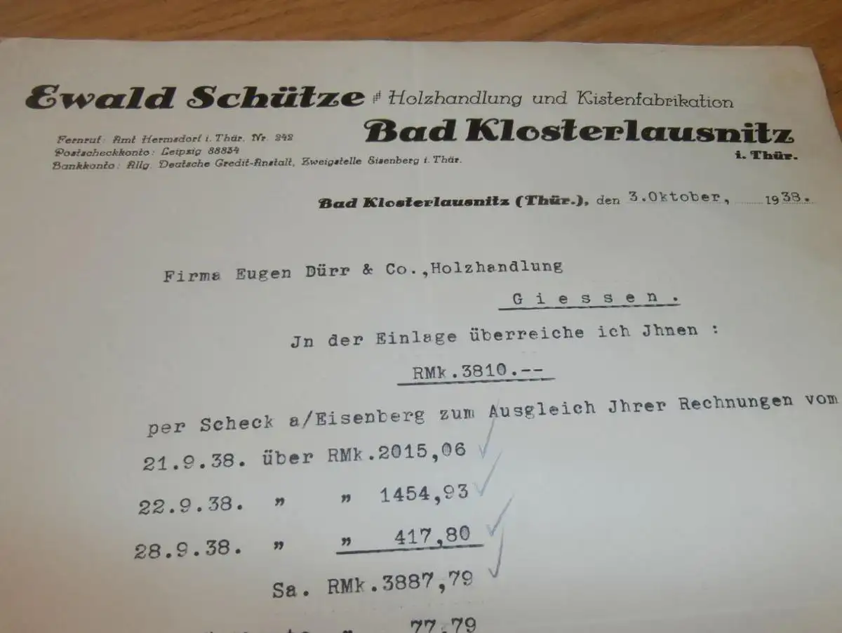 Holzhandel - Ewald Schütze in Bad Klosterlausitz , 1938 , altes Dokument !!