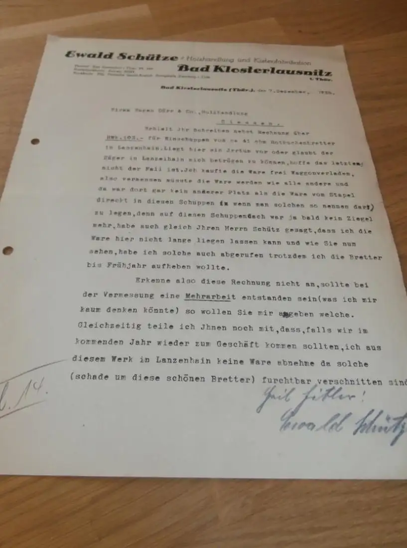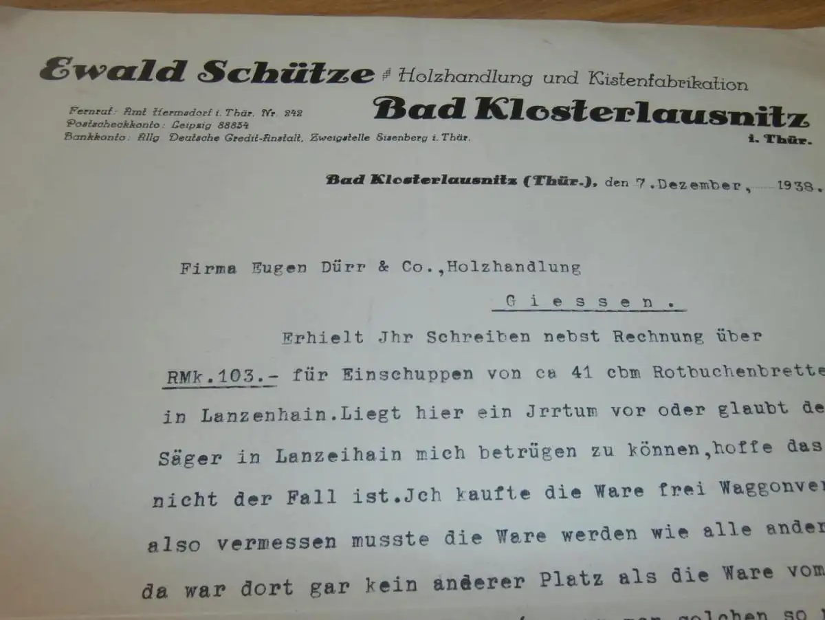Holzhandel - Ewald Schütze in Bad Klosterlausitz , 1938 , altes Dokument !!