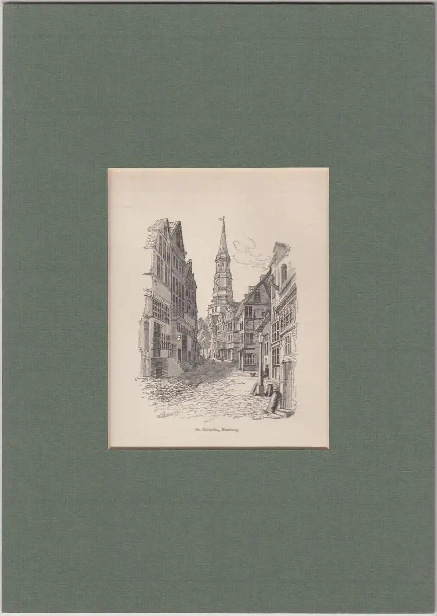 Bemerkungen: Zustand: Gut. Die Grafik ist altersbedingt minimal gebräunt und Ränder leicht berieben // Es handelt sich um einen Holzstich einer Ansicht von Hamburg. Die Grafik ist mittig unterhalb des Motives betitelt, befindet sich in einem Passepartout und hat ein Motivmaß von 12,5 x 10,0 cm.