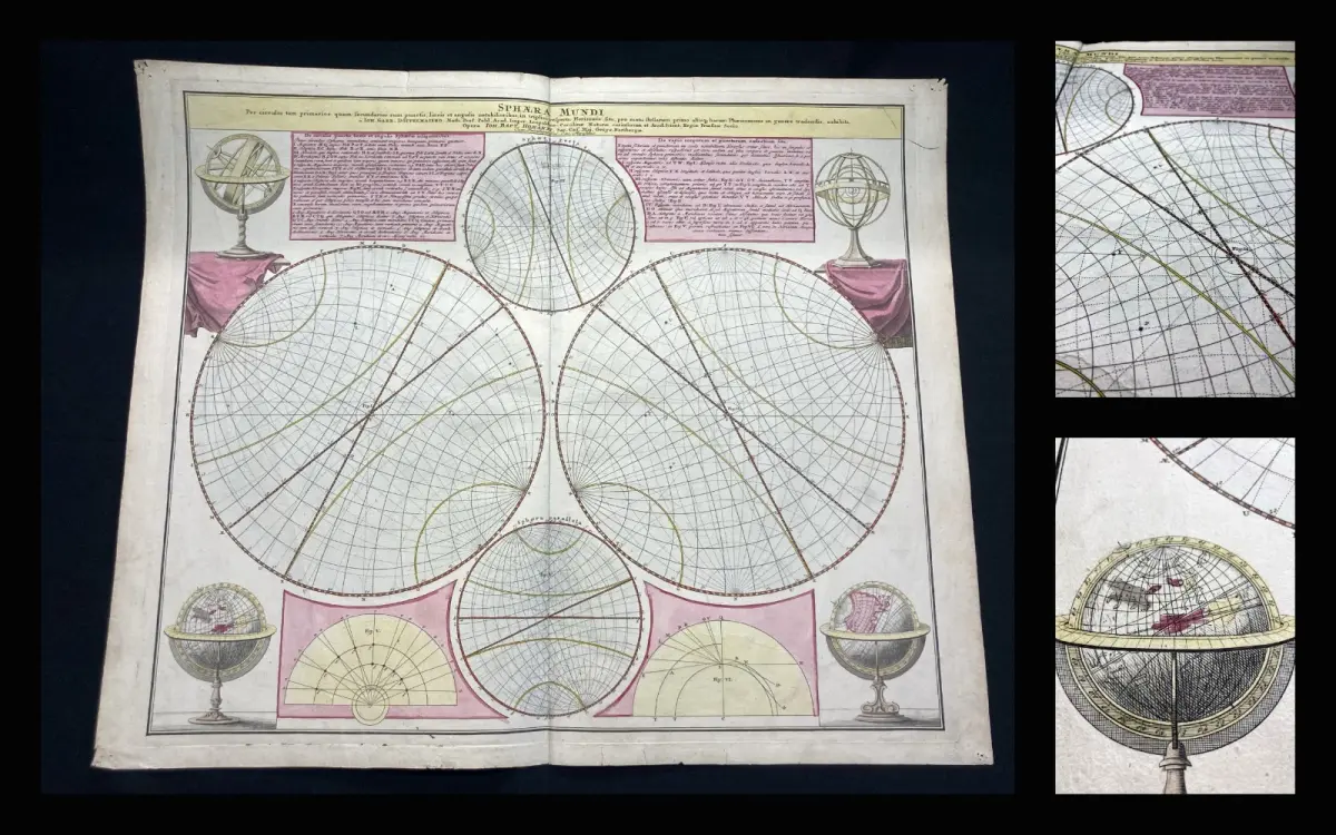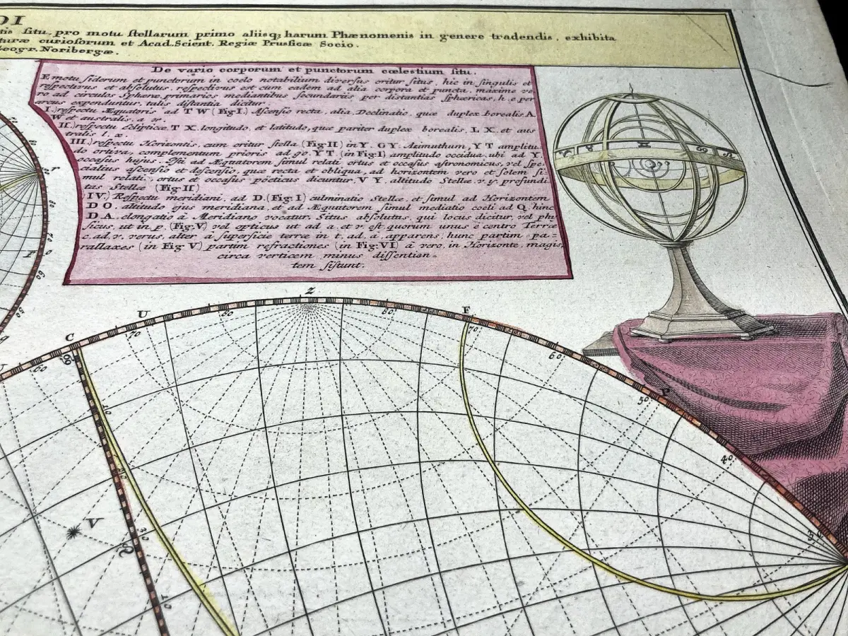 Altkolorierter Kupferstich - Geografische und astronomische Karte / Himmelskarte. Zeigt die äquatorial, ekliptikalen, tropischen und polaren Umlaufbahnen auf den Längen- und Breitengraden. Zwei kleinere Diagramme (unten) zeigen die Sonnenpositionen in Relation zur Erde mit ihrer Lichtbrechung. In den Ecken Darstellung von 2 Globen (unten) und 2 astronomischen Instrumenten (oben). -
