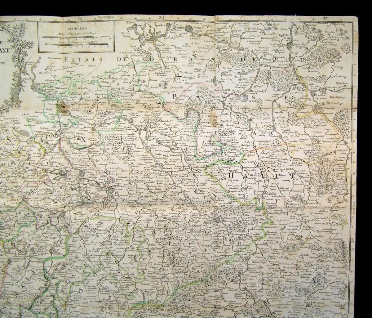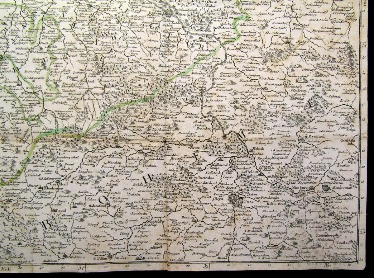 Auf Leinen gezogen, etwas gebräunt und fleckig, an der rechten unteren Ecke stockfleckig. Mit wenigen kleinen Löchlein an den Falzen. Gesamt noch guter Zustand der seltenen Karte. Gutes Exemplar. Bilder sind ein Bestandteil der Zustandsbeschreibung. Zustand wurde bereits im Preis berücksichtigt.