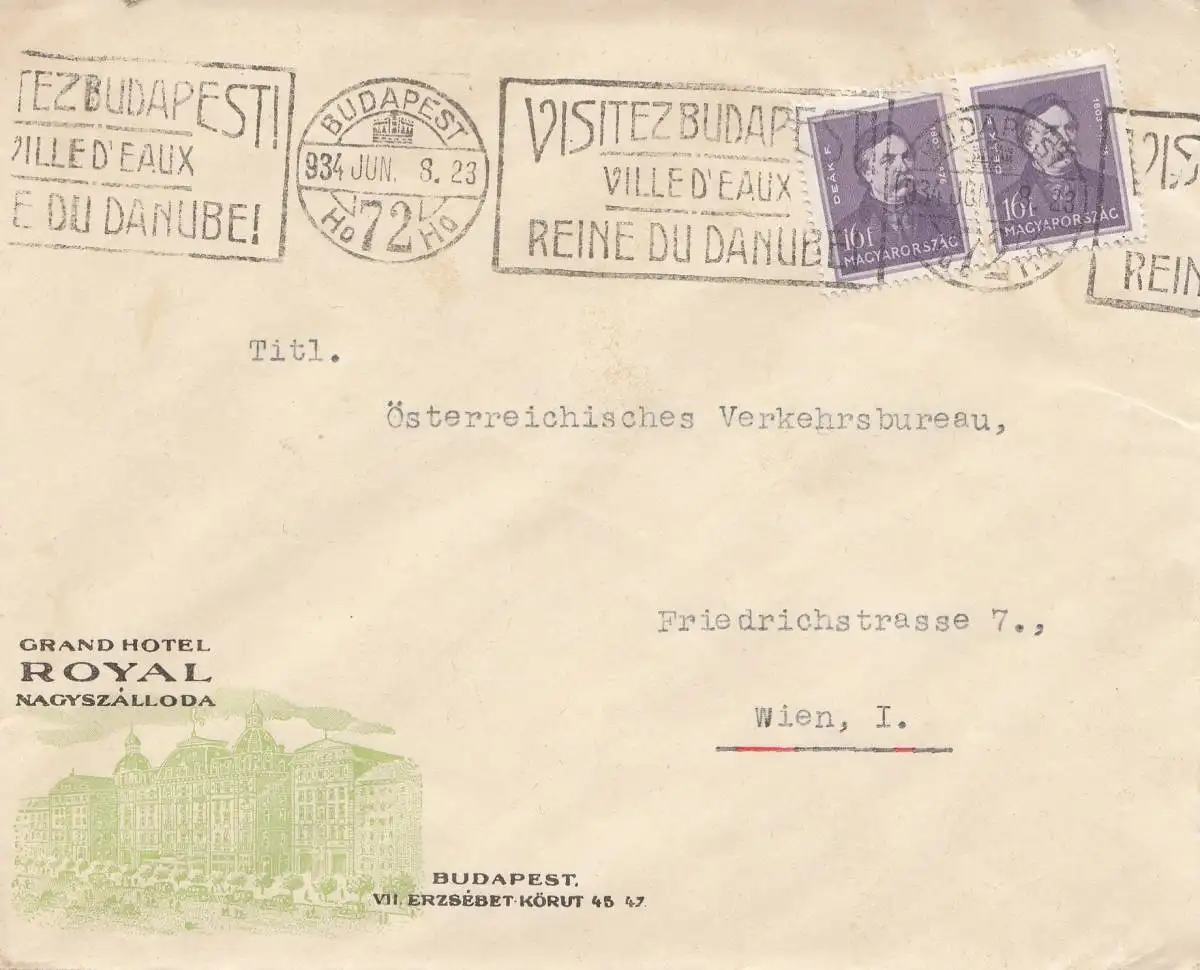 Hongrie: 1934: Budapest avec un timbre publicitaire à Vienne