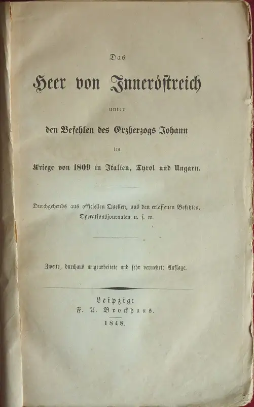 Titel: Das Heer von Inneröstreich unter den Befehlen des Erzherzogs Johann im Kriege von 1809 in Italien, Tyrol und Ungarn. Durchgehends aus officiellen Quellen, aus den erlassenen Befehlen, Operationsjournalen u.s.w. 2., durchaus umgearbeitete und sehr vermehrte Auflage
