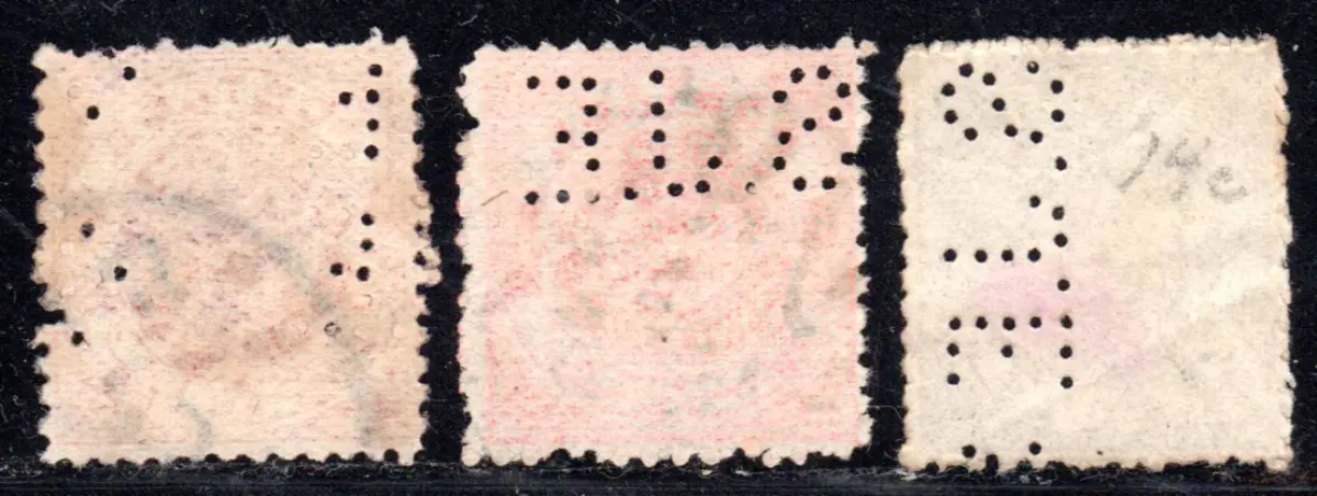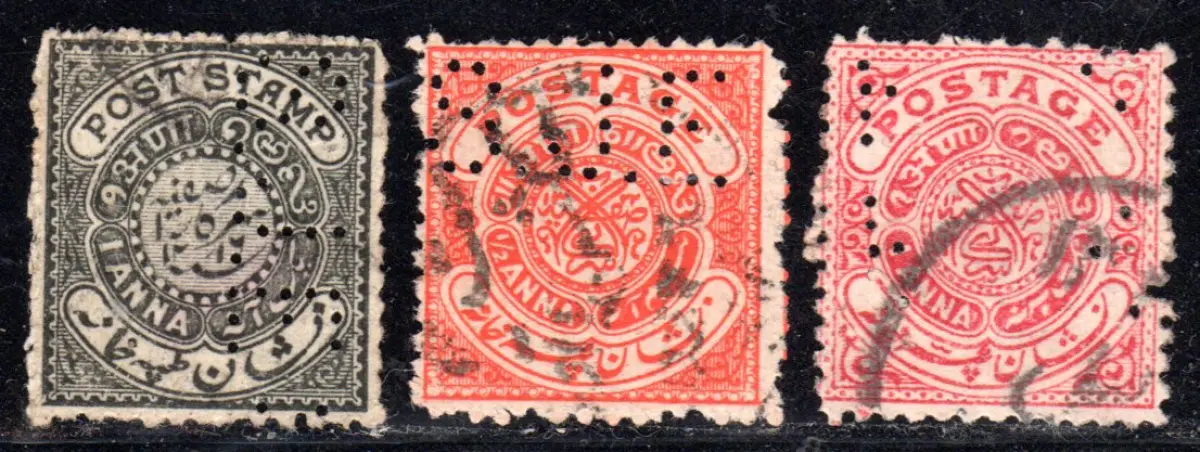Hyderabad, 3 alte Marken mit Firmenlochung / perfin