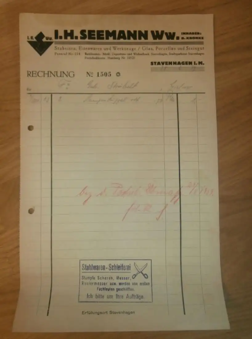 I.H. Seemann in Stavenhagen i. Mecklenburg , 1939 , B. Kronke , Porzellan , Steingut , alte Rechnung !!!