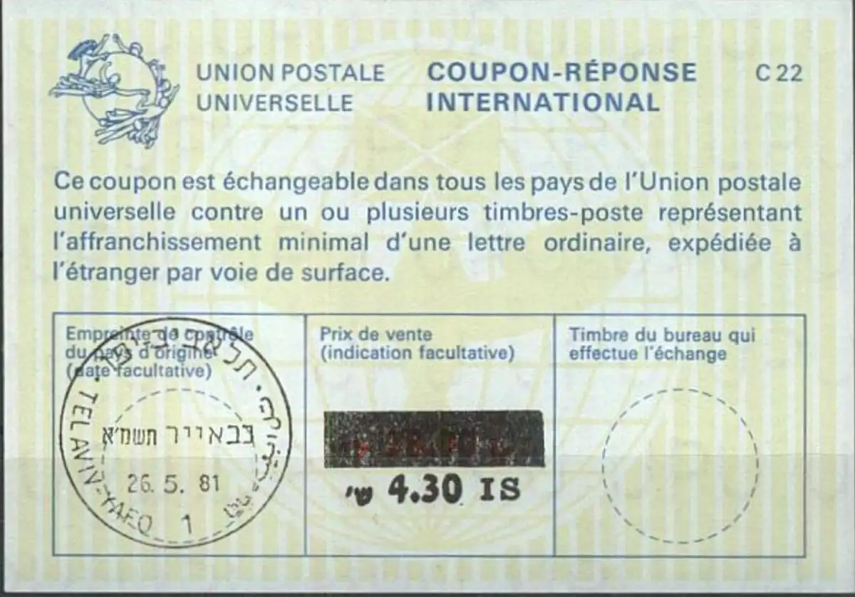 ISRAEL 1981 Nr. 110 IAS IRC CRI Int. Antwortschein 4.30 auf 28.00 IS