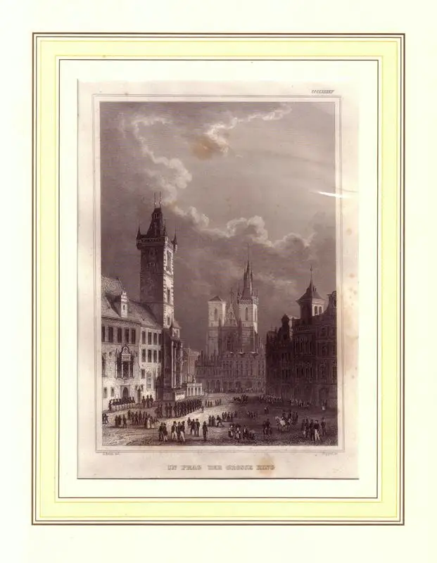 Altstädter Ring (Staromêstské námêsti) mit Rathaus, Teynkirche u. Haus zur steinernen Glocke. - Johann Gabriel Friedrich Poppel (1807-1882), Kupfer- u. Stahlstecher, Architekturzeichner, Maler u. Verleger (Thieme/ Becker 27, S. 266). - Etwas stockfleckig