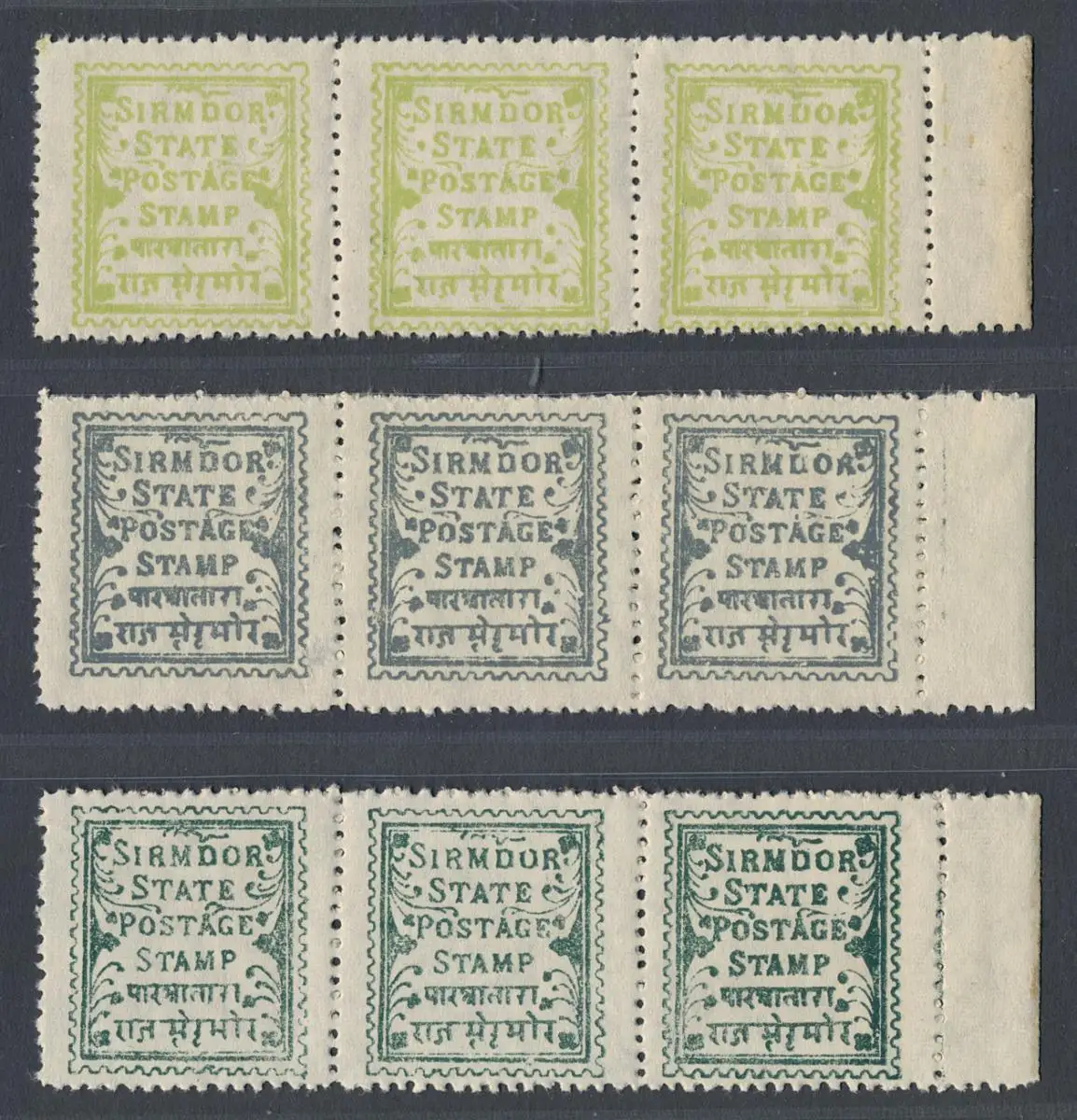 Landesname SIRMOOR / STATE / POSTAGE / STAMP. Inschrift in Englisch und Hind,