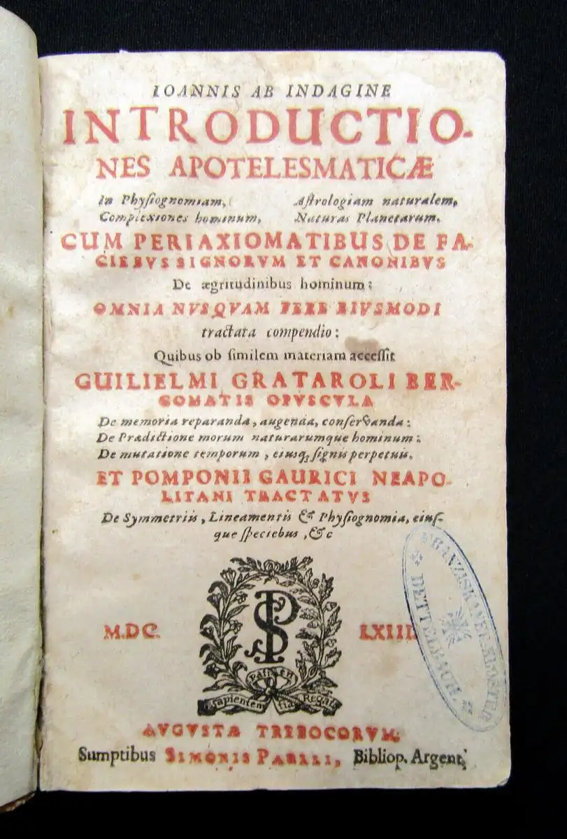 Indagine Johannes ab Introductiones nes apotelesmaticae in physiognomiam ...1663