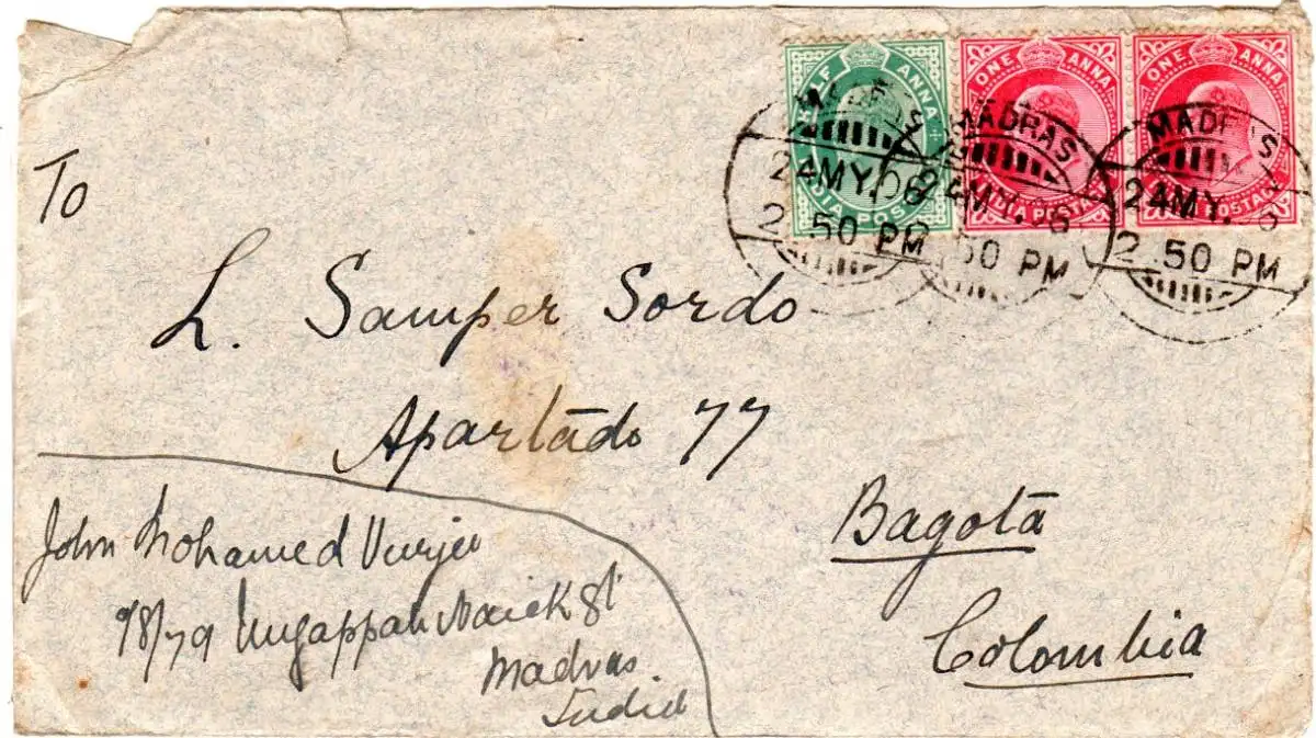 Indien 1906, 1/2+2x 1 A. auf Brief v. Madras n. Bogota Columbia