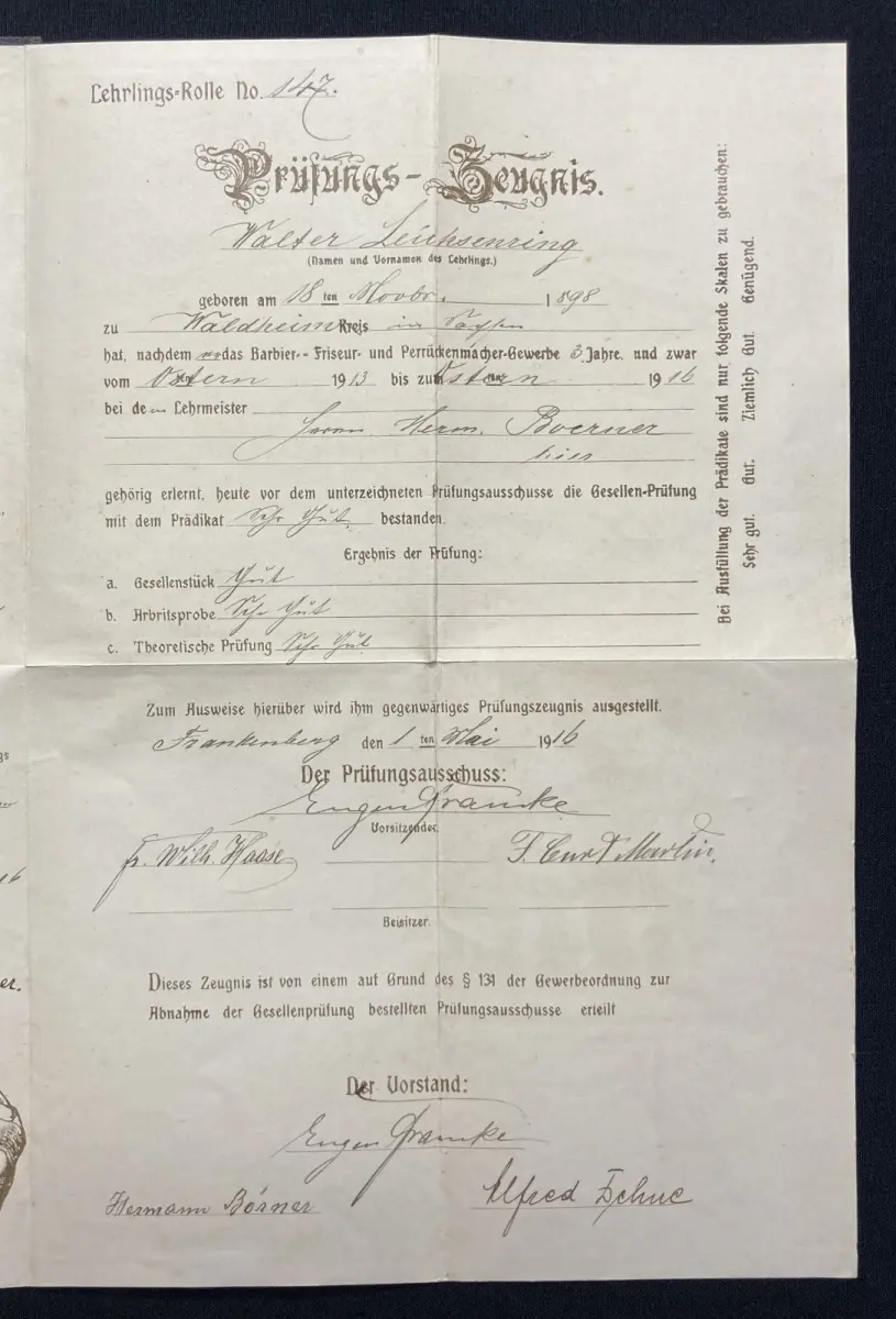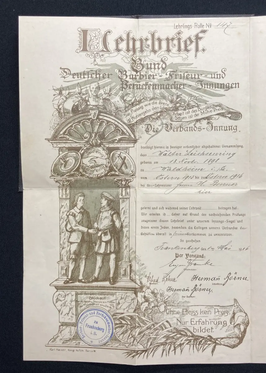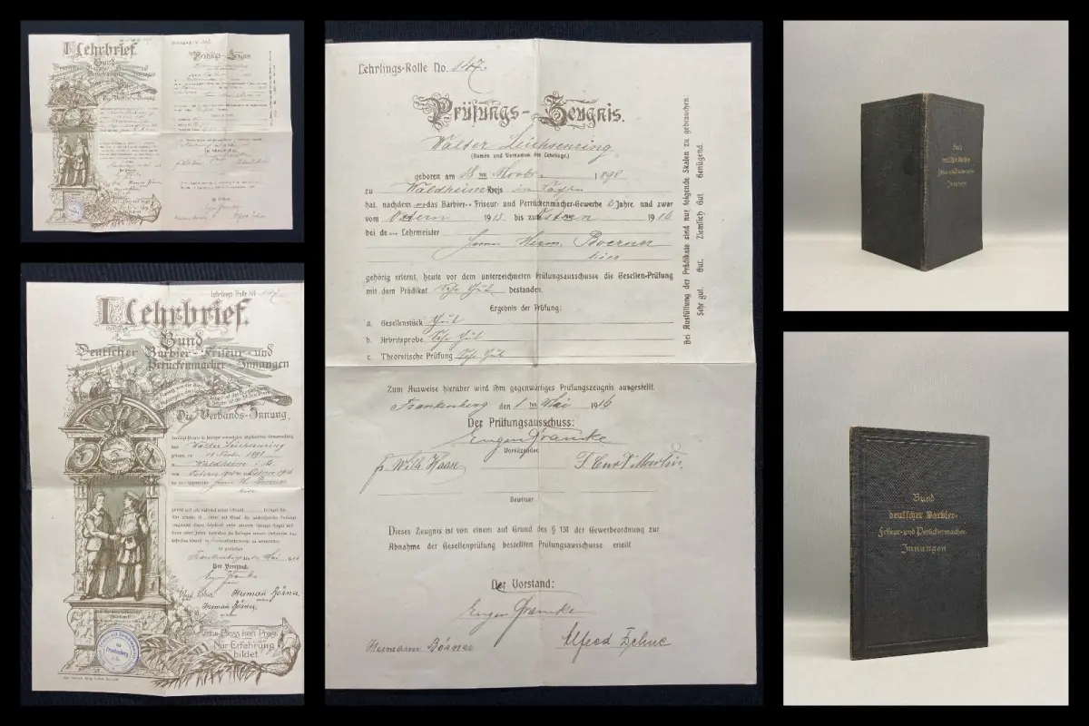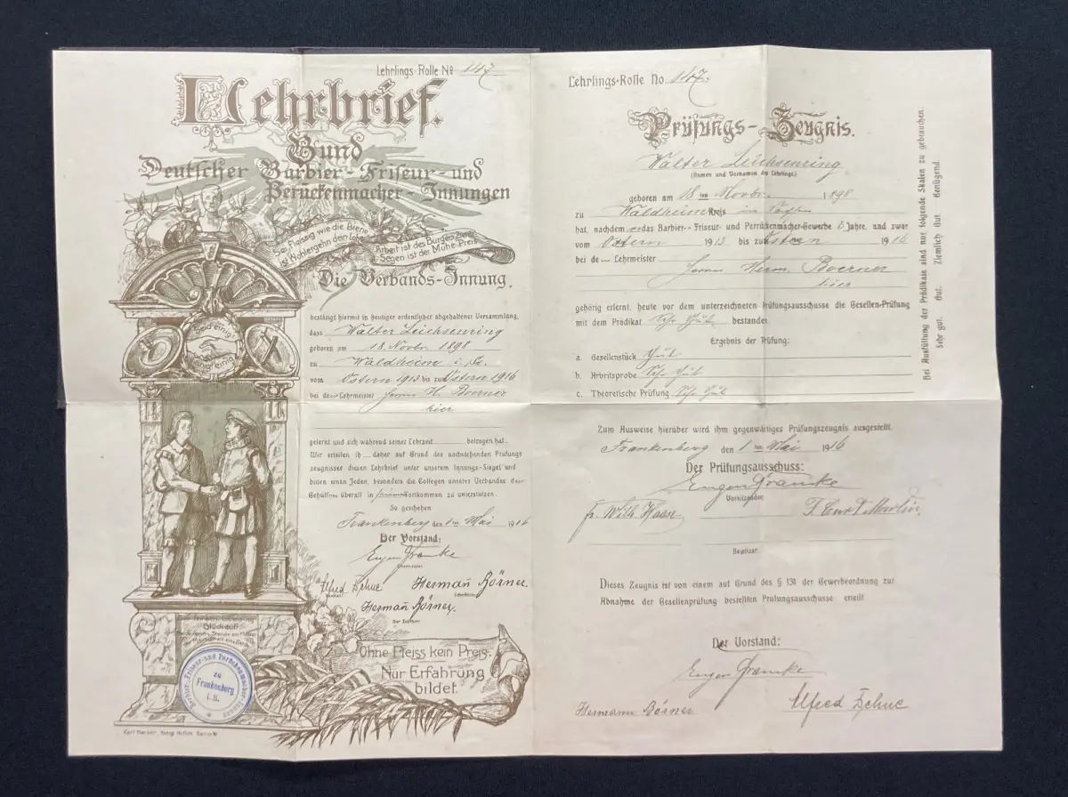 Einband gering bestoßen, Urkunde an einem Knick mit kleinem Einriss, ansonsten sauber. Sehr guter Zustand.