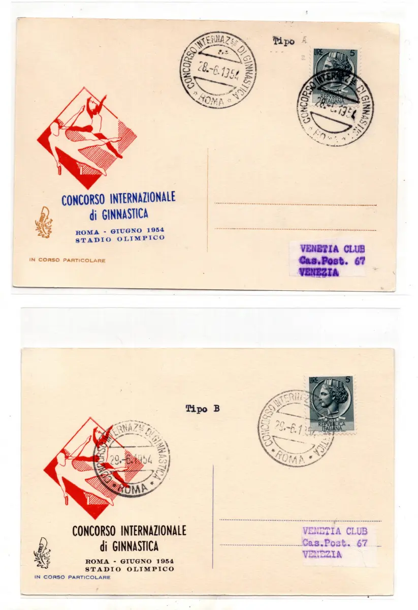 Internationaler Turnwettbewerb - Postkarten Venetia Club C - Internationaler Turnwettbewerb - Lot von zwei Postkarten, die vom Venetia Club für die Veranstaltung vorbereitet wurden - Ann. Gedenkstätte Rom 28.6.54 und Rom 29.6.54 - Ungewöhnlich für Spezialisten Cod.540/182