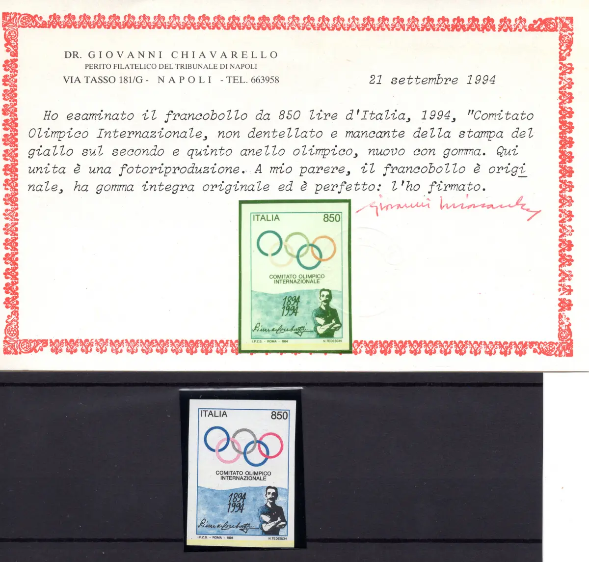MNH - Vollgummi - - Internationales Olympisches Komitee 850 Lire Nr. 2122a ungezähnt ohne Gelbdruck im Olympiaring - Selten - Kat. 750 Euro - Cert. G. Chiavarello Cod.774/182