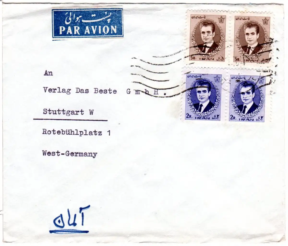 Iran Persien, 4 Marken auf Brief m. blauem 2-sprachigem Luftpost-Etikett