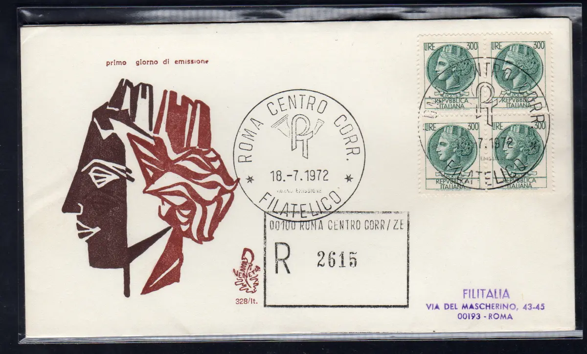 Italien 1972 Syrakus Lire 300 Viertel auf Reiseumschlag Racc. für Italien mit Annullierung der Ankunft - Abreise Annullo Roma Philatelico Cod. 1022/Venetia