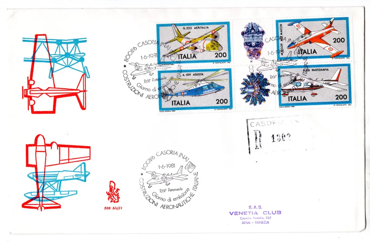 Italien 1981 Flugzeugbau Block auf FDC Venetien Nr. 506/bis gereist Einschreiben mit Stornierung der Ankunft - Hausliste Euro 54 - Cod. 1669/WEB