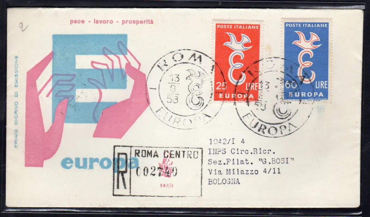 Italien FDC Venetia 1958 Europa '58 gereist Racc. für Italien Italien Italien 1958 Europa '58 auf Umschlag FDC gereist Racc. für Italien mit Annullierung der Ankunft Cod. 438 / Venetien