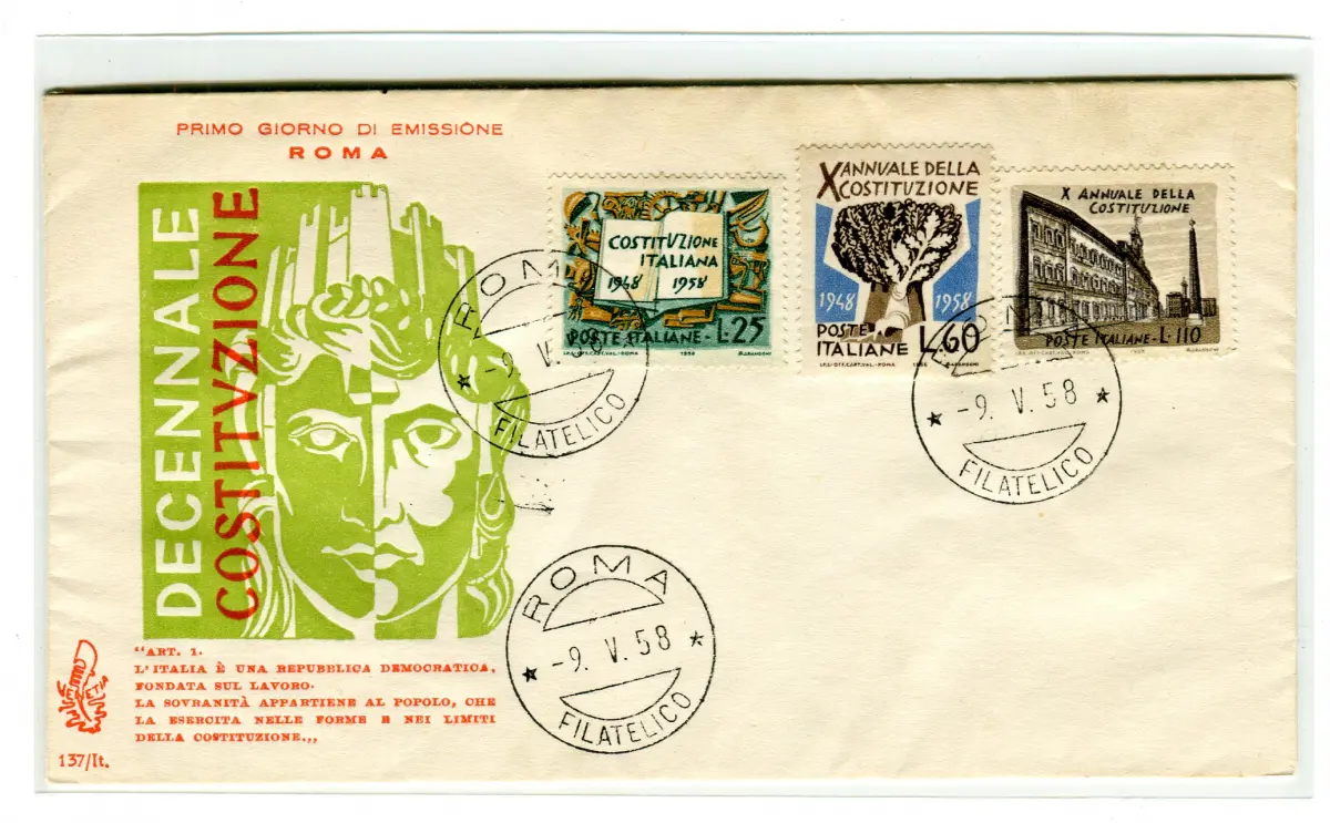 Italien FDC Venedig 1958 Jahrzehnt Verfassung nicht gereist Italien 1958 Jahrzehnt Verfassung auf Umschlag FDC nicht gereist Cod. 174 / Venetien