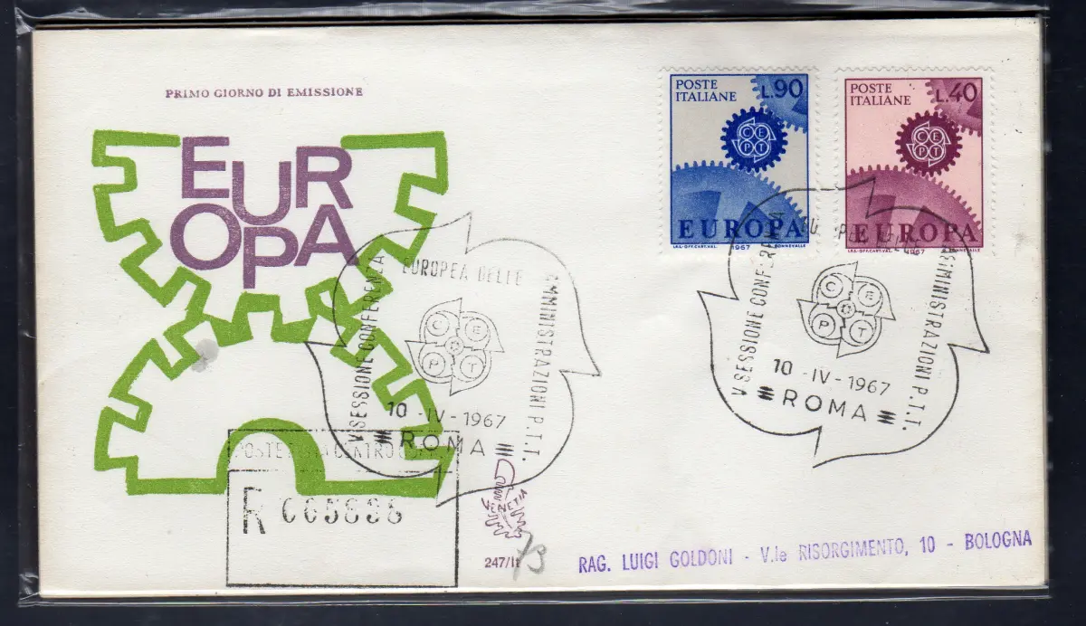 Italien FDC Venetia 1967 Europa gereist Racc. für Italien Italien Italien 1967 Europa auf Reiseumschlag Racc. für Italien mit Annullierung der Ankunft Sonderannullo Rom - Auf der Rückseite Lire 15 Syracusana Cod. 746/Venetia