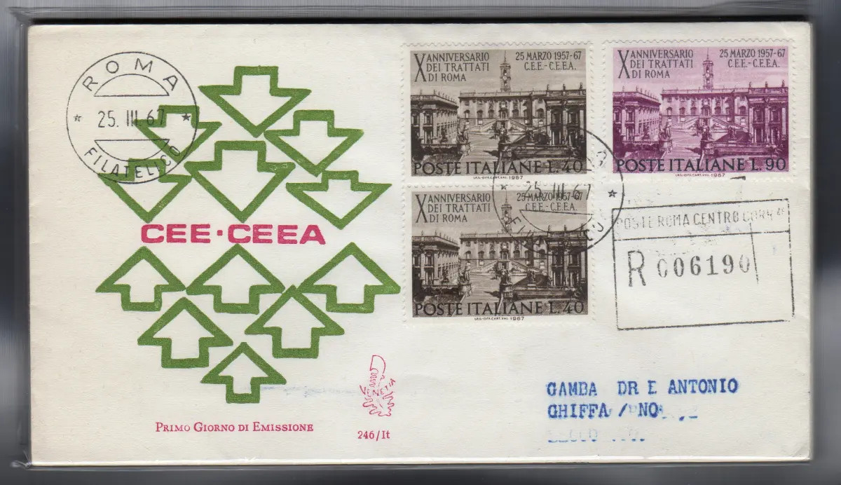Italien FDC Venetia 1967 Verträge Paar + Einzelreise Racc. für Italien Italien Italien 1967 Römische Verträge Paar + Einzelstück auf Reiseumschlag Racc. für Italien mit Annullierung der Ankunft Annullo Rom - Cod. 744 / Venetien