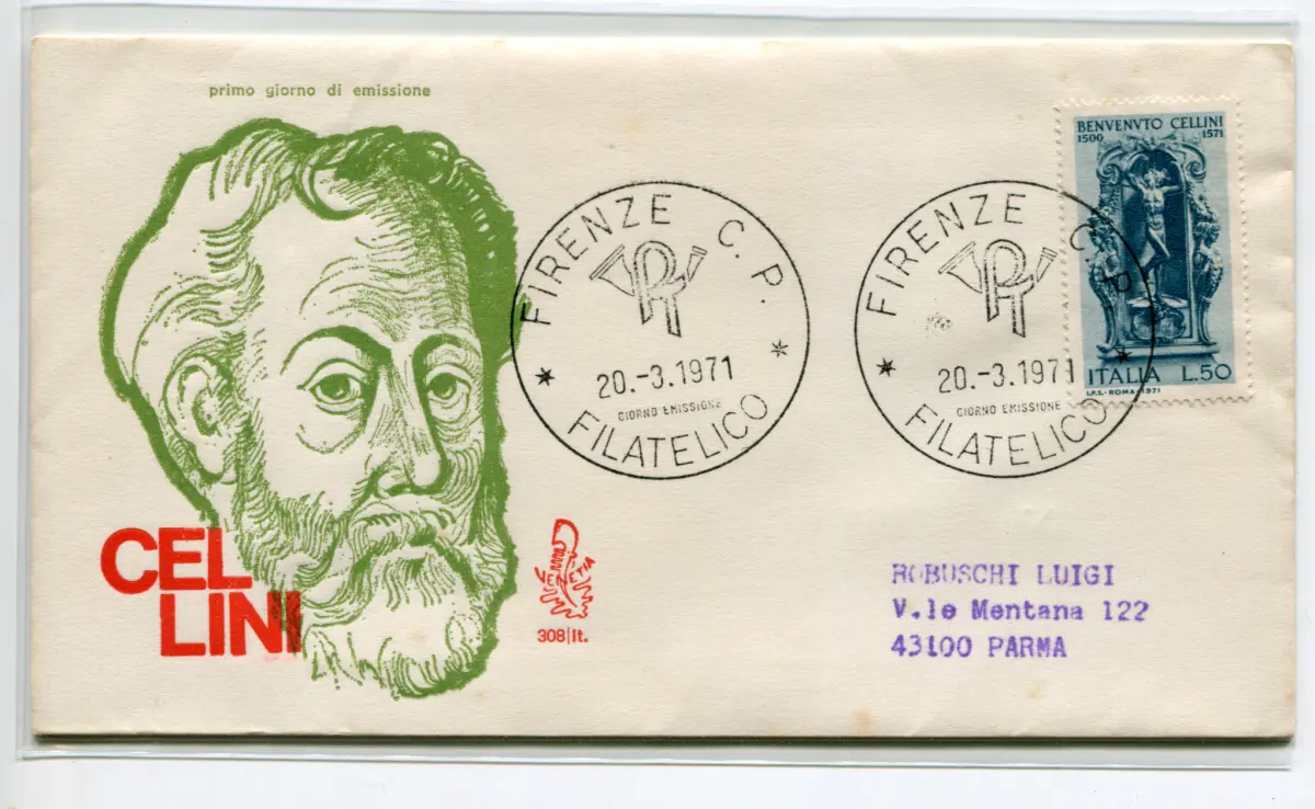 Italien FDC Venetia 1971 Cellini reiste nach Italien Italien 1971 Cellini auf Umschlag reiste nach Italien ohne Annullierung der Ankunft Annullierung - Abfahrt Florenz Philatelico Cod. 941/Venetia