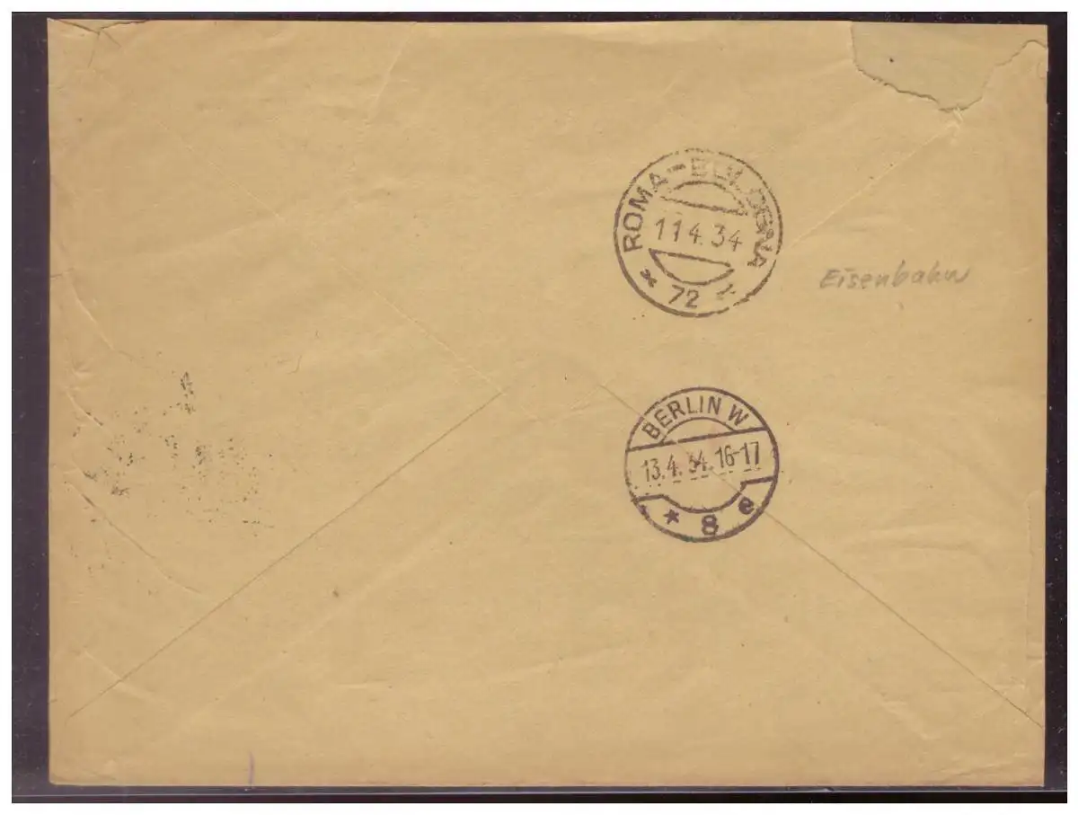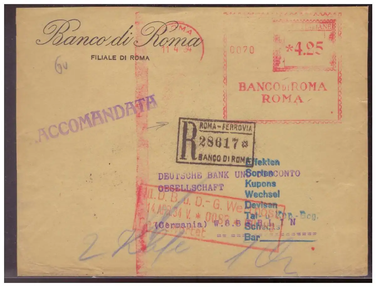 Italien (009081) Bankenbrief Banco di Roma gelaufen mit Bahnpoststempel nach Berlin zur Deutschen Bank 1934
