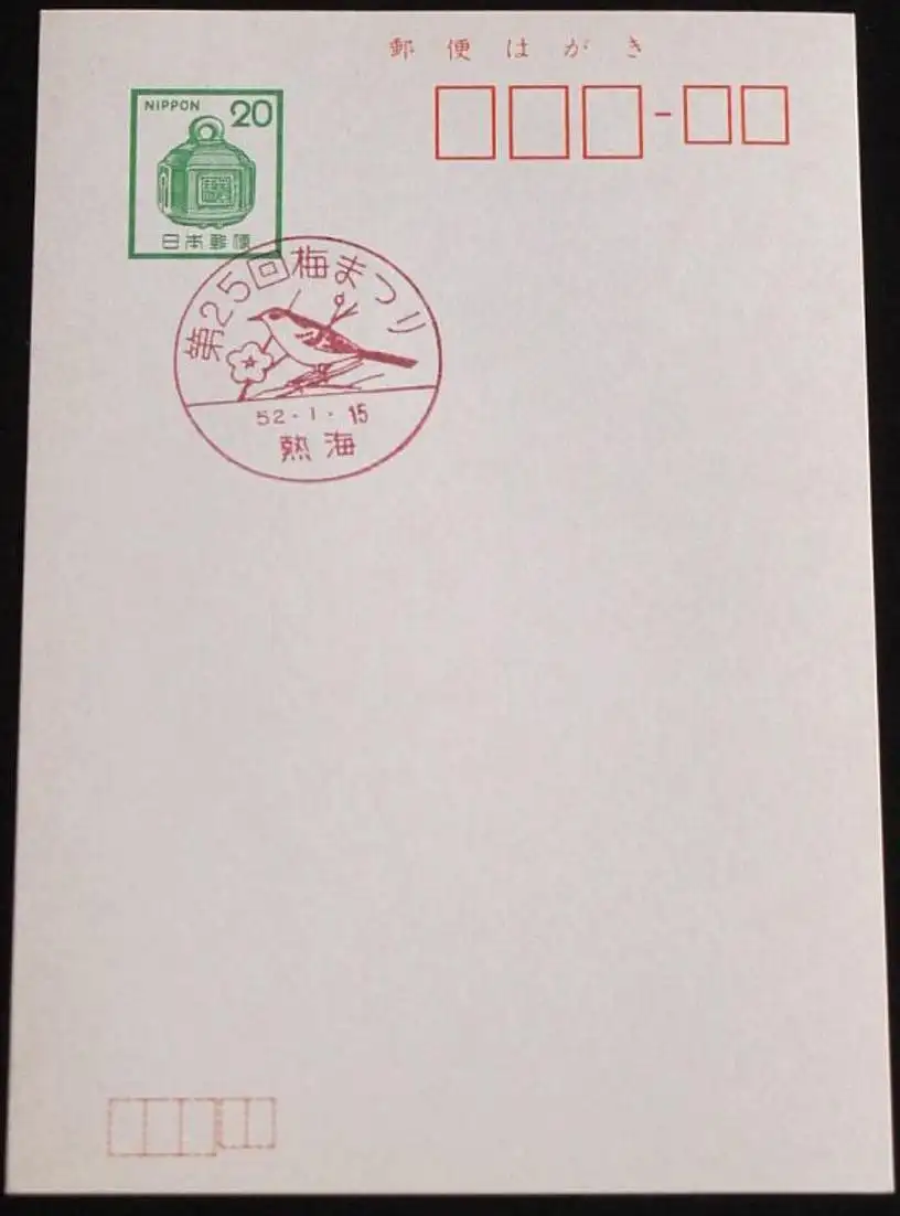 JAPAN GANZSACHE POSTKARTE mit Sonderstempel 15.01.1977 25. UME FEST 52.01.15