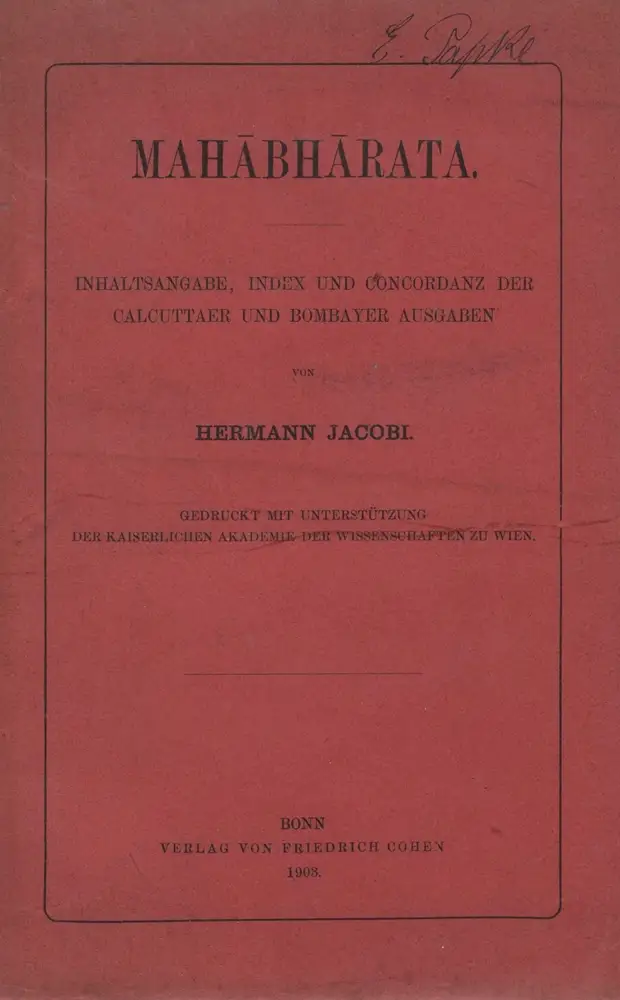 Jacobi, Hermann: Mahabharata. Inhaltsangabe, Index und Concordanz der Calcuttaer und Bombayer Ausgaben. Gedruckt mit Unterstützung der Kaiserlichen Akademie der Wissenschaften zu Wien.