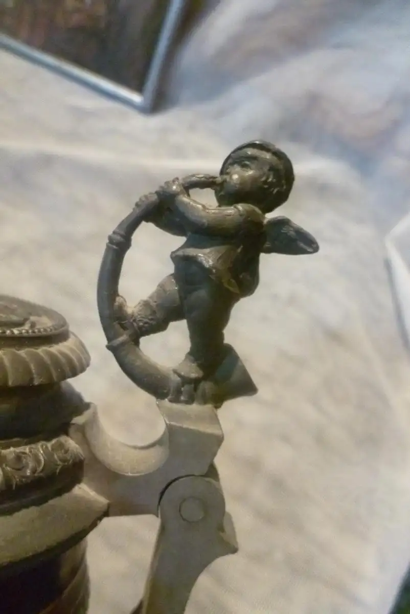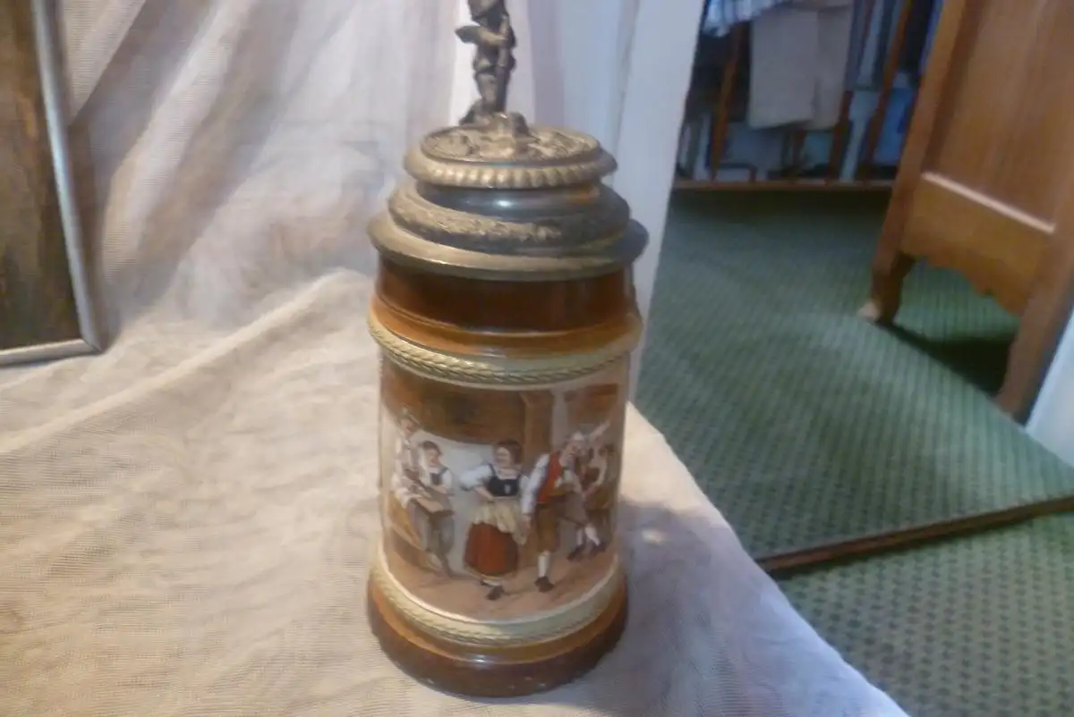 Jäger bzw Bergsteiger Bierkrug Historismus um 1880 Merkelbach oder Villeroy&Boch ,Schauseite handbemalte Wirtshausscene mit Dirnen Scenen