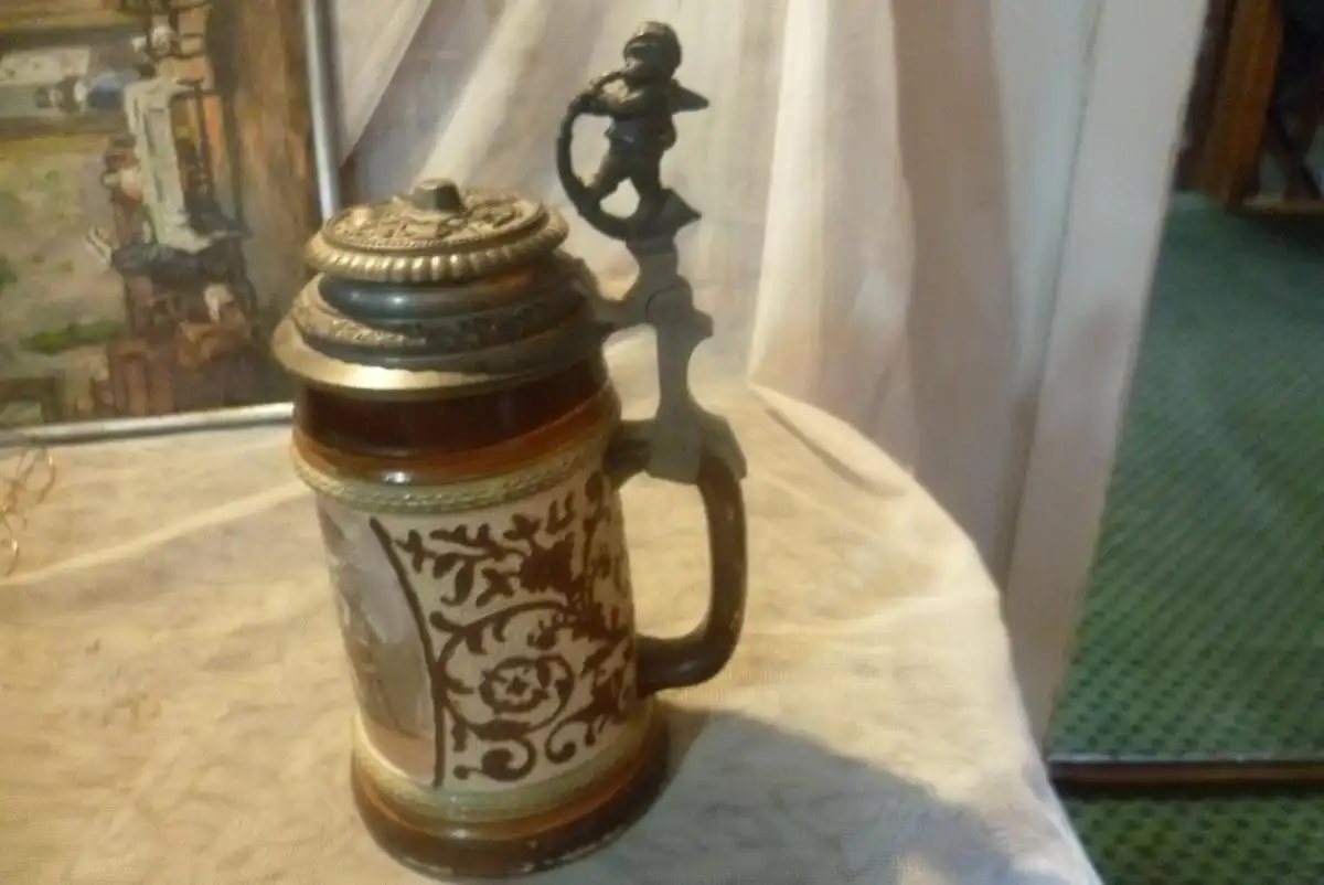 Jäger bzw Bergsteiger Bierkrug Historismus um 1880 Merkelbach oder Villeroy&Boch ,Schauseite handbemalte Wirtshausscene mit Dirnen Scenen..Bodennummer geprest:187 Pinsel 41